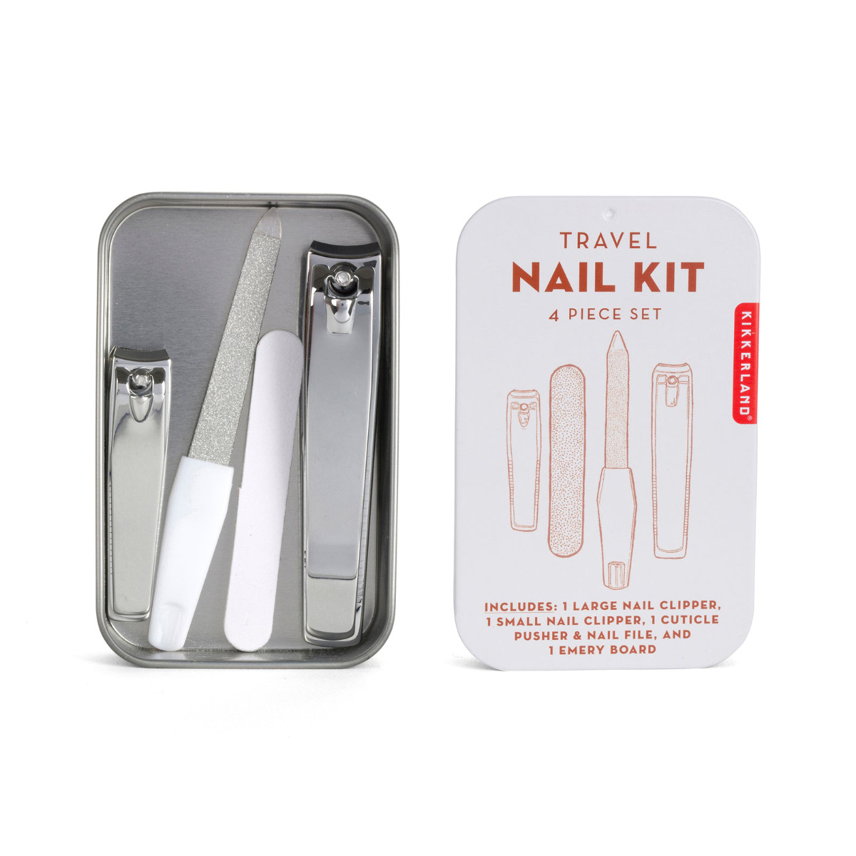 This handy tin kit features everything you need to trim, shape and buff your nails. Contents include: 2 nail clippers (large & small), 4 acetone wipes and 1 nail file/cuticle pusher.
